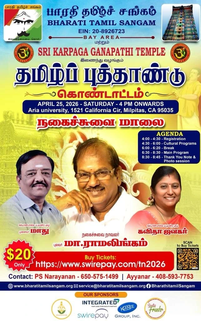 Bharati Tamil Sangam, in association with Sri Karpaga Ganapathi Temple, warmly invites you and your family to celebrate Tamil New Year with an evening full of culture, music, and fun!